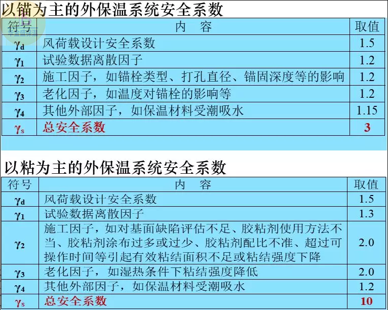 歐洲技術(shù)認(rèn)證準(zhǔn)則ETAG 004《帶抹面的外墻外保溫系統(tǒng)(ETICS)》中規(guī)定:安全性核算,以錨為主的外保溫系統(tǒng)不算粘結(jié),以粘為主的外保溫系統(tǒng)不算錨固。
